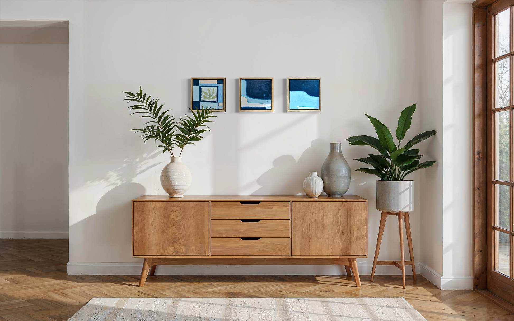 Framed in a natural wood stain floater frame with 1.5" depth.