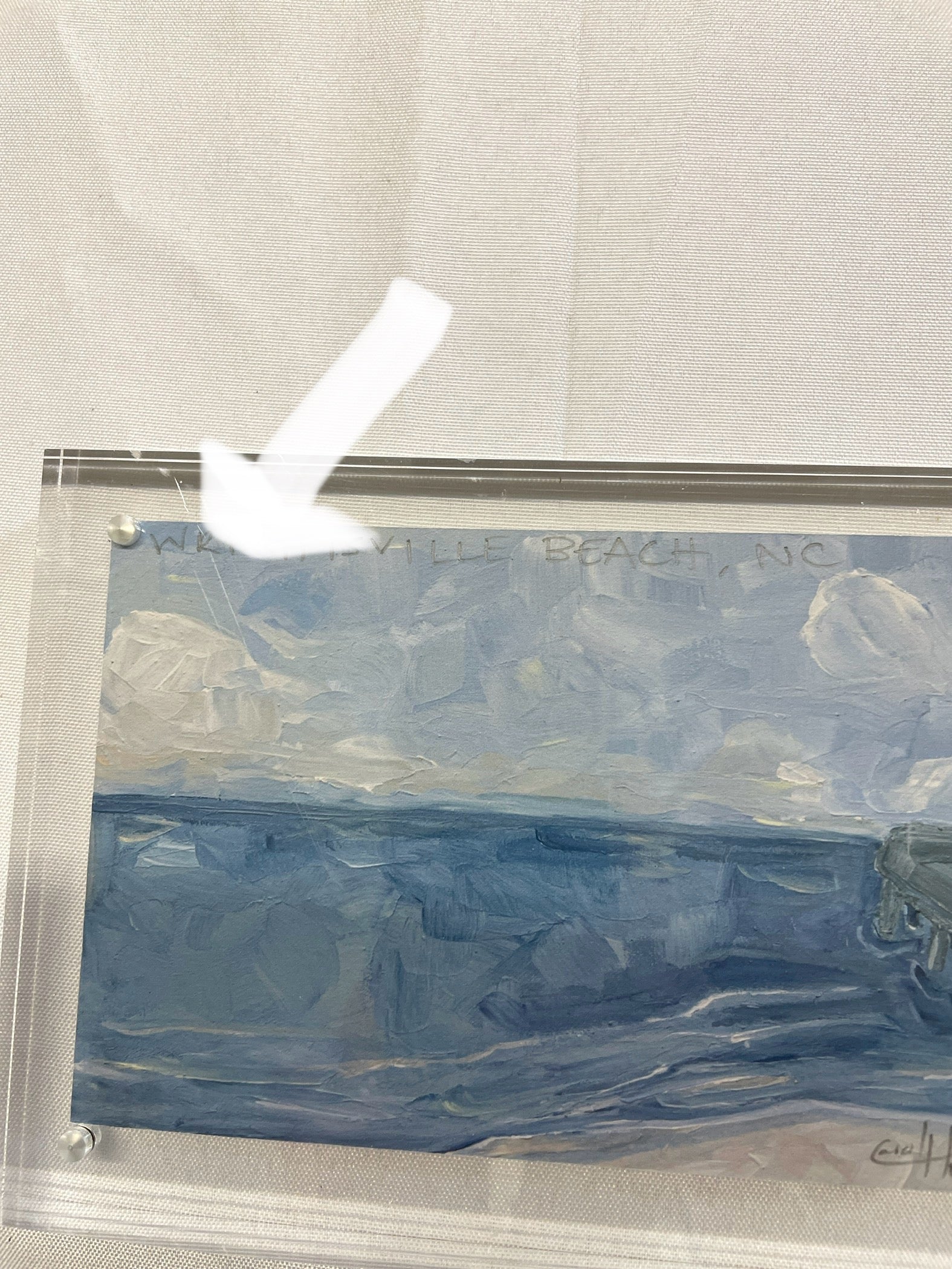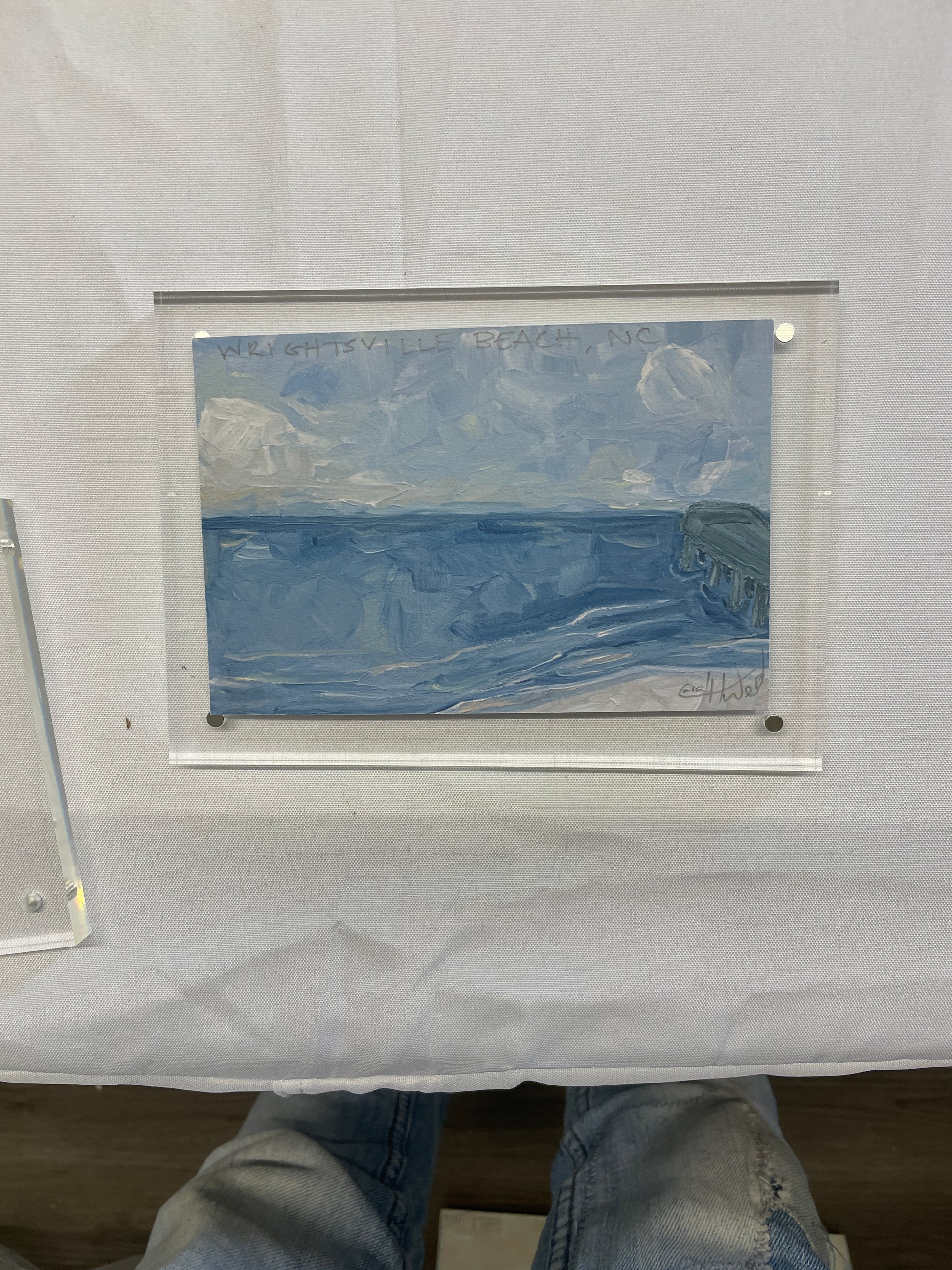 Wish You Were Here in acrylic frames , each sized 5x7 and hand signed by artist and has the painted note -“Wish You Were Here” with a sailboat on the back of each print. They sit on bookshelf or coffee table.