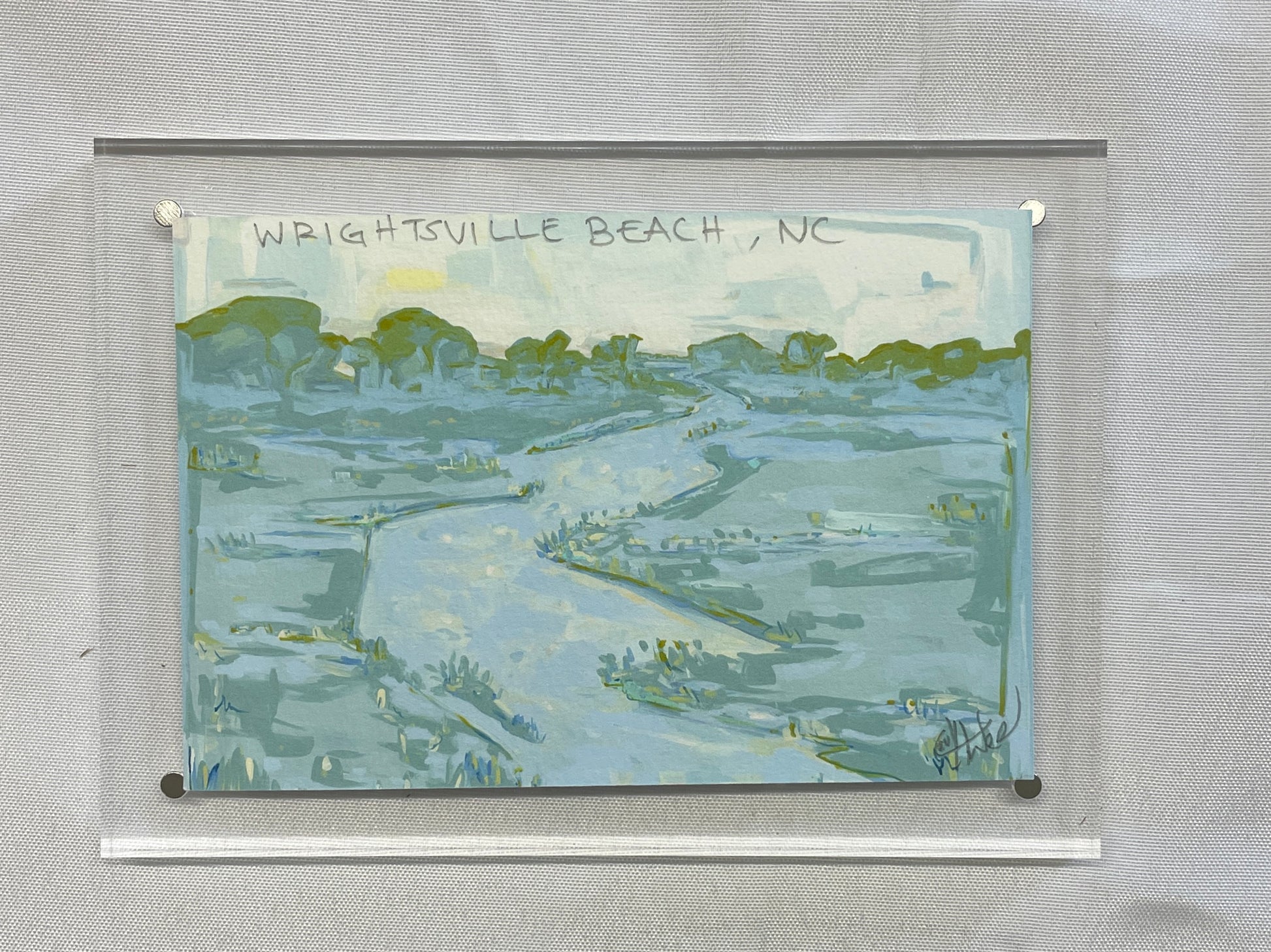 Wish You Were Here in acrylic frames , each sized 5x7 and hand signed by artist and has the painted note -“Wish You Were Here” with a sailboat on the back of each print. They sit on bookshelf or coffee table.